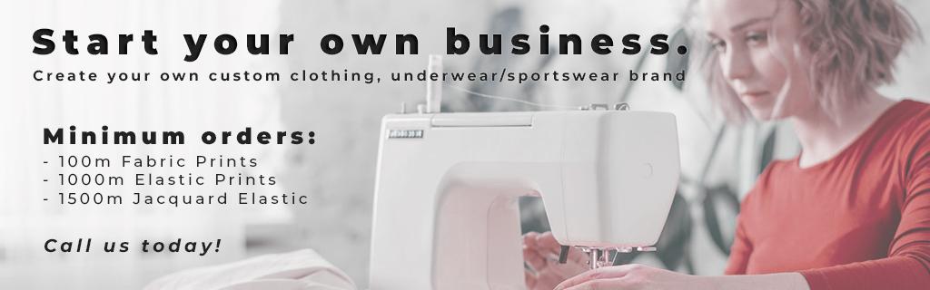 Start your own small business with a custom clothing or sportswear brand only 1000m minimum for printed elastic, 1500m minimum for jacquard elastic and 100m minimum for fabric printing.